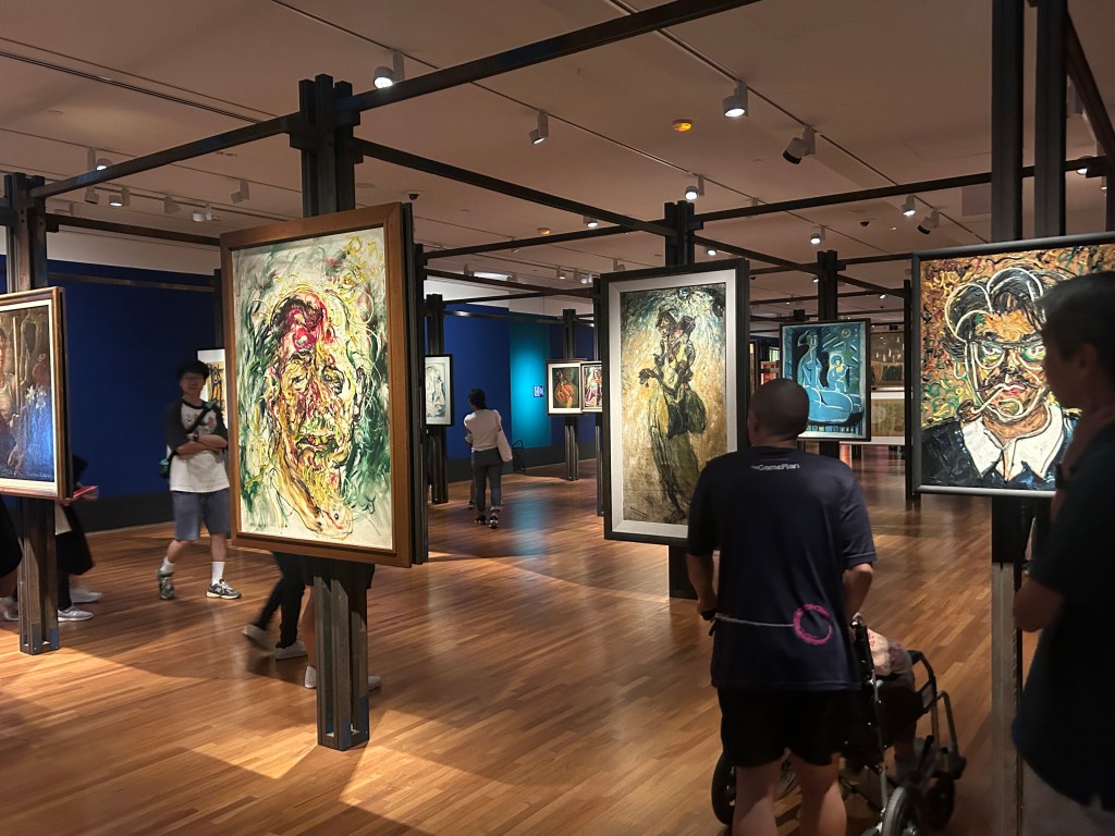 The area ahead at the opening section was curiously the exact opposite of the colour assault of the summery walls one experienced when nearer to the entrance. The works here are mounted on transparent crystal easels (seemingly suspended in the air) based on Brazilian artist Lina Bo Bard’s concept. These crystal easels was originally part of a groundbreaking concept utilised at Sao Paolo’s Museum of Art to remind museum goers to break down the barriers of the venue, and to ensure that art is liberated and within reach for the individual. The WOHA (Singaporean based architectural company) was employed to bring the idea to life right here in Singapore . This establishment significantly holds a track record of designing futuristic buildings focus on infusing skyscrapers with natural elements. Of course, such a concept is not a novel one. For instance, Spanish artist Antonio Gaudi is a stark example of being the forerunner who infused nature with his architectural plans which culminated in his masterpieces in Barcelona. What is interesting though, about WOHA is that this company’s portfolio included many of the nature-inspired buildings in on local soil, including the very ones right in my neighbourhood. I truly applaud the concept of the crystal easels as a very novel presentation style never seen before (unless you have been to the Sao Paolo Museum of Art, of course). It did take me awhile to figure out that the artwork labels were mounted directly behind the painting. It was definitely a facepalm moment. But hey, you live and learn.