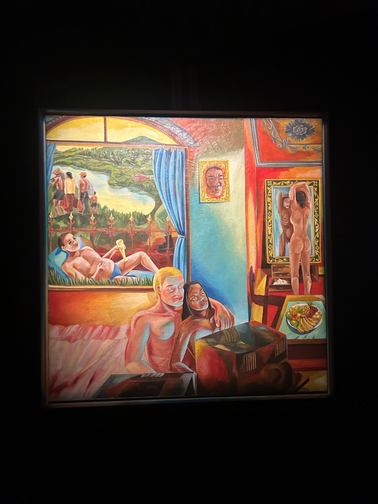 Majestically propped up on an opposite wall near the Library of the Tropics is Smear Siahaan’s Olympia. Epic in scale and featuring a traditional iconograhy of a reclining woman that has been seen repeated in countless masterpieces throughout the history of Western Art, the grandeur of the work’s scale contrasts with the whimsical bright summery colours and satorical portrayal of a blond woman who is seemingly in the act of being pleased by the locals. She sits as if on a throne and almost looks as if it’s her birthright to be in that position of royalty, yet looking mildly ridiculous in her nudity and touristy sunglasses.