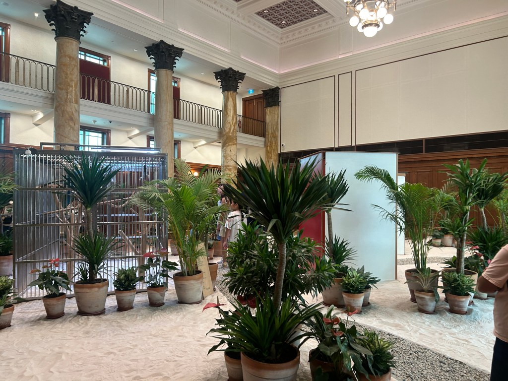 Helio Oiticica’s Tropicalia (1967, remade 2023) is an engaging piece of immersive installation that questions cultural and artistic norms by intertwining Brazilian culture with contemporary art. Here, a lush tropical setup complete with luxuriant greenery, a sandbox and two screechy cobalt macaws was set up on site. Latin American art in the 1960s was trending in the Neo-Concrete style, with its constructivist style coldly alienated by the reality of the social tension enveloping the continent. Against this gritty backdrop, the installation is an attempt to forge a brand new Latin America through verve and vitality, by engaging all the senses1. With its refusal to conform to the constraints of the museum space that it is contained in, the sharp contrast is highlighted manyfold when placed against the severe austerity of the location of the former Supreme Court of Singapore (If you weren’t aware before, the National Gallery was formerly a courthouse). Sometimes I guess the message gets sent across just that much more effectively through the likely mixture of hyperbole and irony. After all, to quote André Gide, ‘The work of art is the exaggeration of an idea.’ Touché.