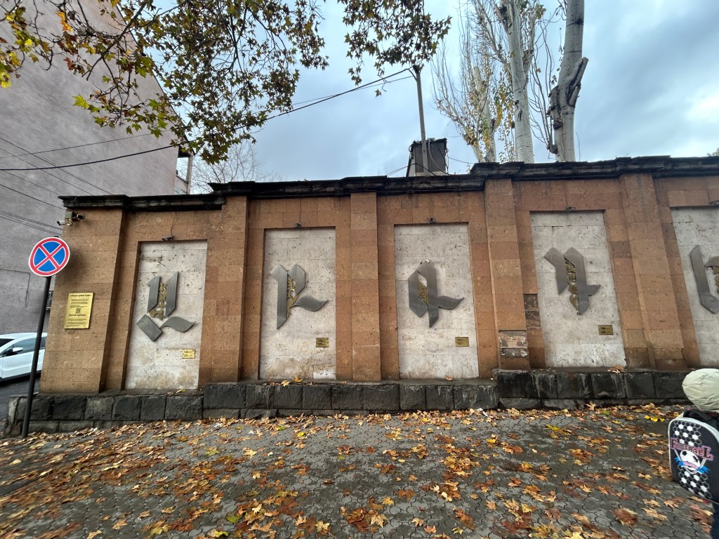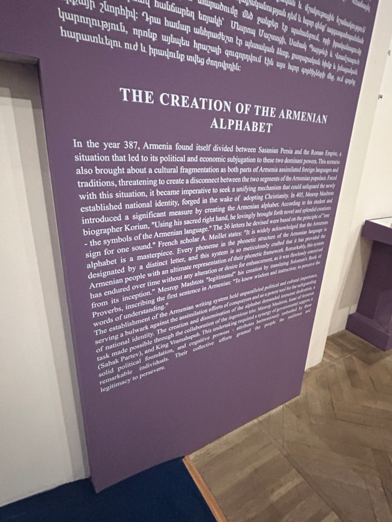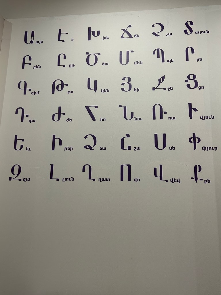 Another highly representative element of Armenian culture lies in their highly idiosyncratic writing system. Since their invention in AD 405, these letters have not only served their key function to record and communicate, but also function as numbers, cryptographs, riddles and handicraft patterns in folk art. Indeed, artists, carpet weavers, embroiderers, sculptors, linguists, calligraphists, jewellers also frequently feature these thirty nine letters as design elements .5 I, for one, have never seen a writing system so celebrated and integrated into so many aspects of art and society.